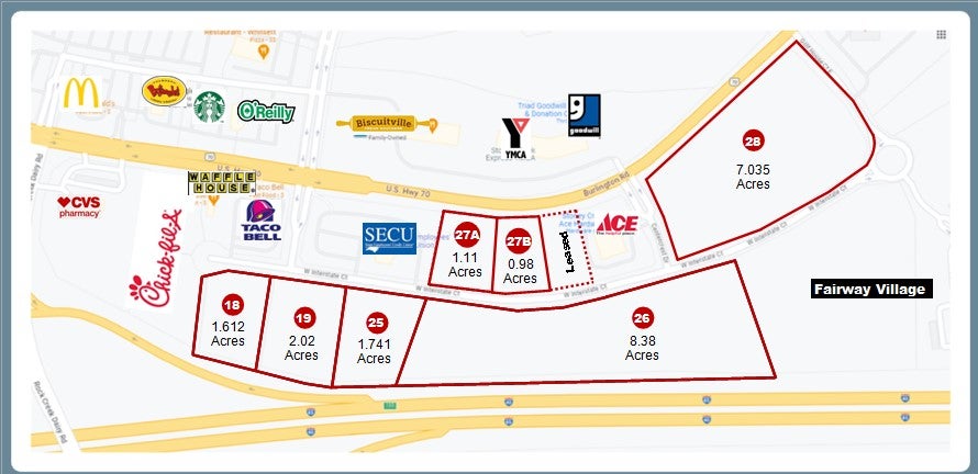 Located in vibrant Submarket of Eastern Guilford County, Stoney Creek commercial lots range from 0.98 to 8.38 acres in size. Offers Interstate 85/40 frontage at Rock Creek Dairy Road exit.